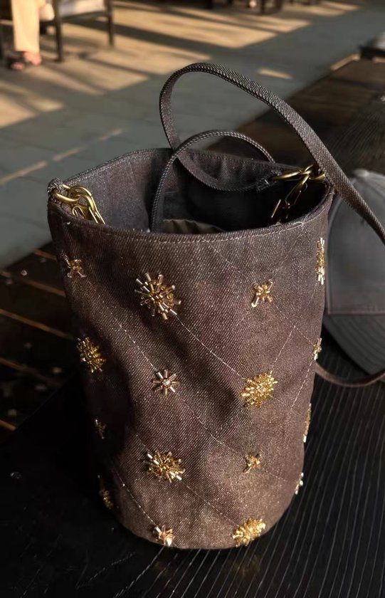 Denim Embroidered Bucket Shoulder Bag Adjustable Strap Handle 14 x 21 cm Brown
