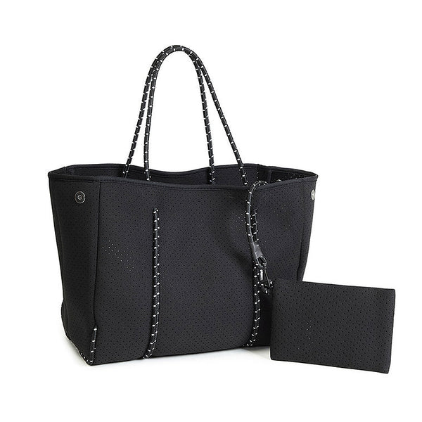 Fabric Tote Shoulder Beach Bag Rope Handle + Pouch Bag Black