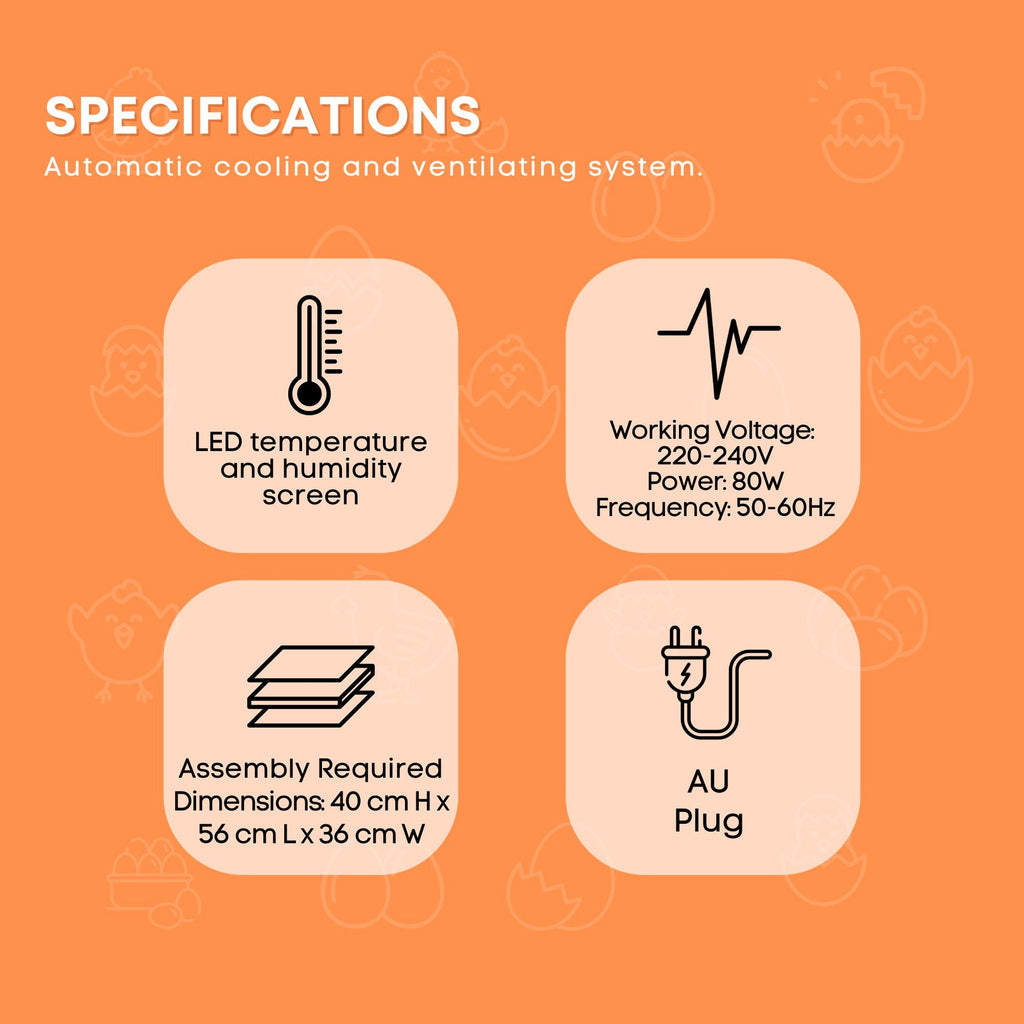 - Egg capacity: 112 chicken/duck/quail (approx.)