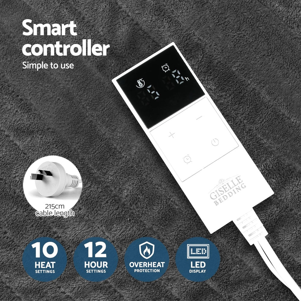 Giselle Electric Throw Rug Heated Blanket Washable Fleece Timer Grey