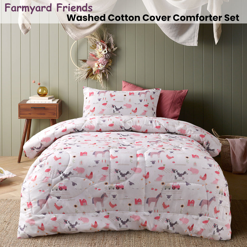 Bring the joy of the countryside to bedtime with our Happy Kids Farmyard Friends 2 Piece Washed Cotton Cover Comforter Set Single. It is made from natural breathable cotton that is soft against the skin for a cosy night's sleep. Featuring a playful print of horses, chickens, barns, and tractors in cheerful pink, black, mauve, orange, white, red, and purple tones, this set brings a touch of country fun to your child's room. It offers a cosy and breathable feel that keeps kids comfortable all night long.