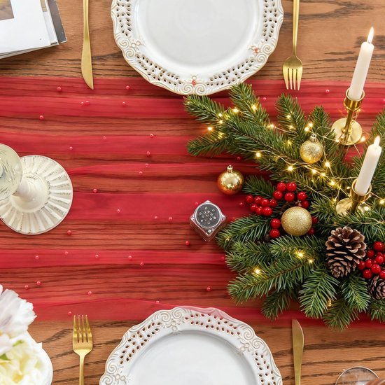 Gauze Tablerunner With Faux White Pearls 30 x 120 Inches Weddings Parties Red