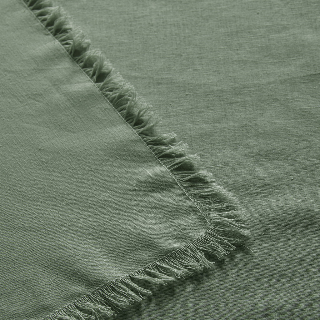 Elevate your dining space with our Vintage Design Homewares Gypsy Green Fringed Washed Linen Cotton Tablecloth, it's the perfect balance between style and usability. This beautiful piece features a delicate fringe.