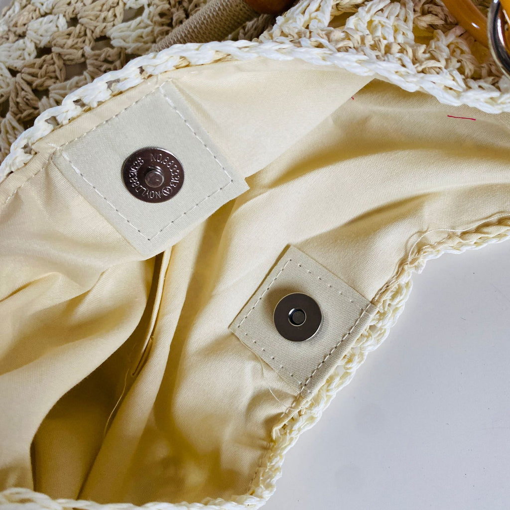 Hand Woven Crochet Paper Rope Crossbody Shoulder Bag Boho Bead Handle Beige