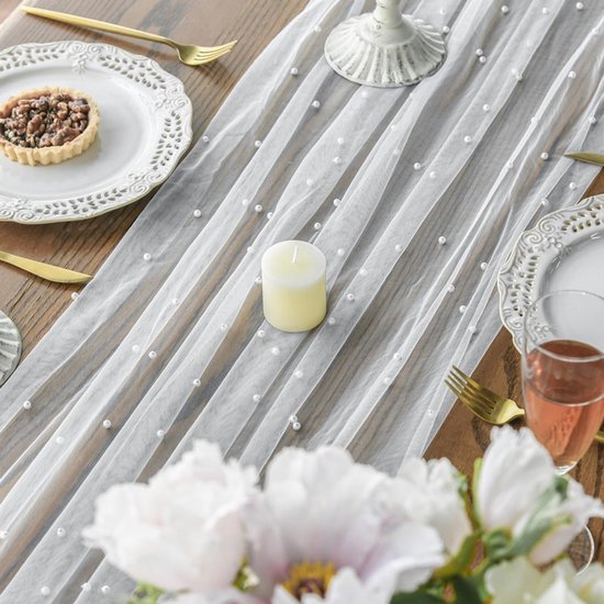 Give your party table an elegant and festive accent with this gauze veil. Embellished with delicate white pearls, it instantly adds a touch of sophistication and texture to any occasion.